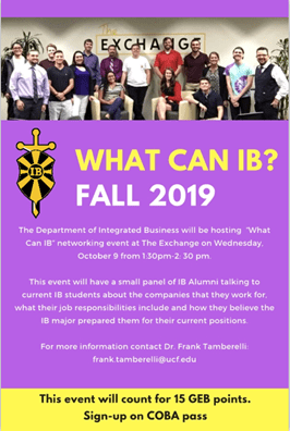 Dr. Frank Tamberelli, Lead Faculty for the Integrated Business major has been facilitating the “What Can IB?” event for several semesters. This event takes place at The Exchange where a small panel of IB Alumni are invited to speak to current IB students about the companies they are currently employed with and their respective roles.