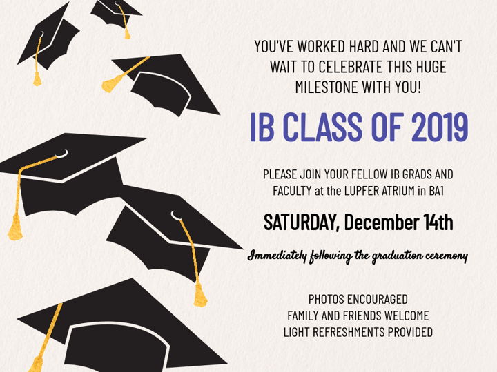 Posted December 6, 2019 by integratedbusinessblog Uncategorized Congratulations IB class of 2019!!! CategoriesUncategorizedShare this: Click to share on Facebook (Opens in new window) Facebook Click to share on X (Opens in new window) X Click to share on LinkedIn (Opens in new window) LinkedIn Click to email a link to a friend (Opens in new window) Email Related integratedbusinessblog View All