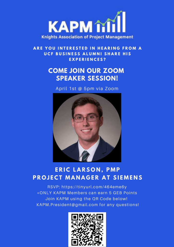 The Knights Association of Project Management (KAPM) is hosting a speaker session with Eric Larson, PMP. Eric will share his journey from the UCF College of Business to become a Project Manager at Siemens.