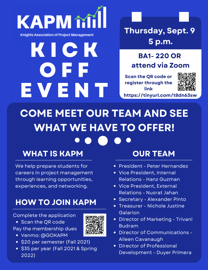 Join the fall kick-off event with the Knights Association of Project Management (KAPM) on Thursday, Sept. 9 at 5 PM at BA1-220 or via Zoom!