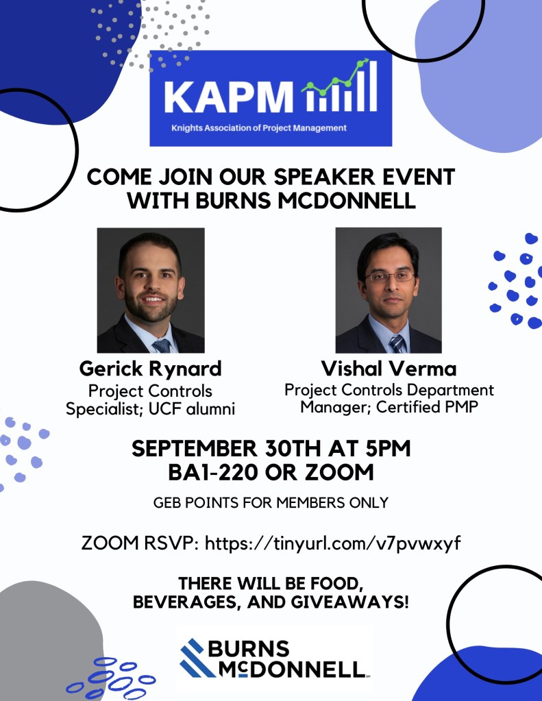 Join Knights Association of Project Management (KAPM) on Thursday, Sept. 30 at 5 PM at BA1-220 or via Zoom as we host Gerick Rynard, Project Controls Specialist, and Vishal Verma, Project Controls Department Manager, with Burns & McDonnell!