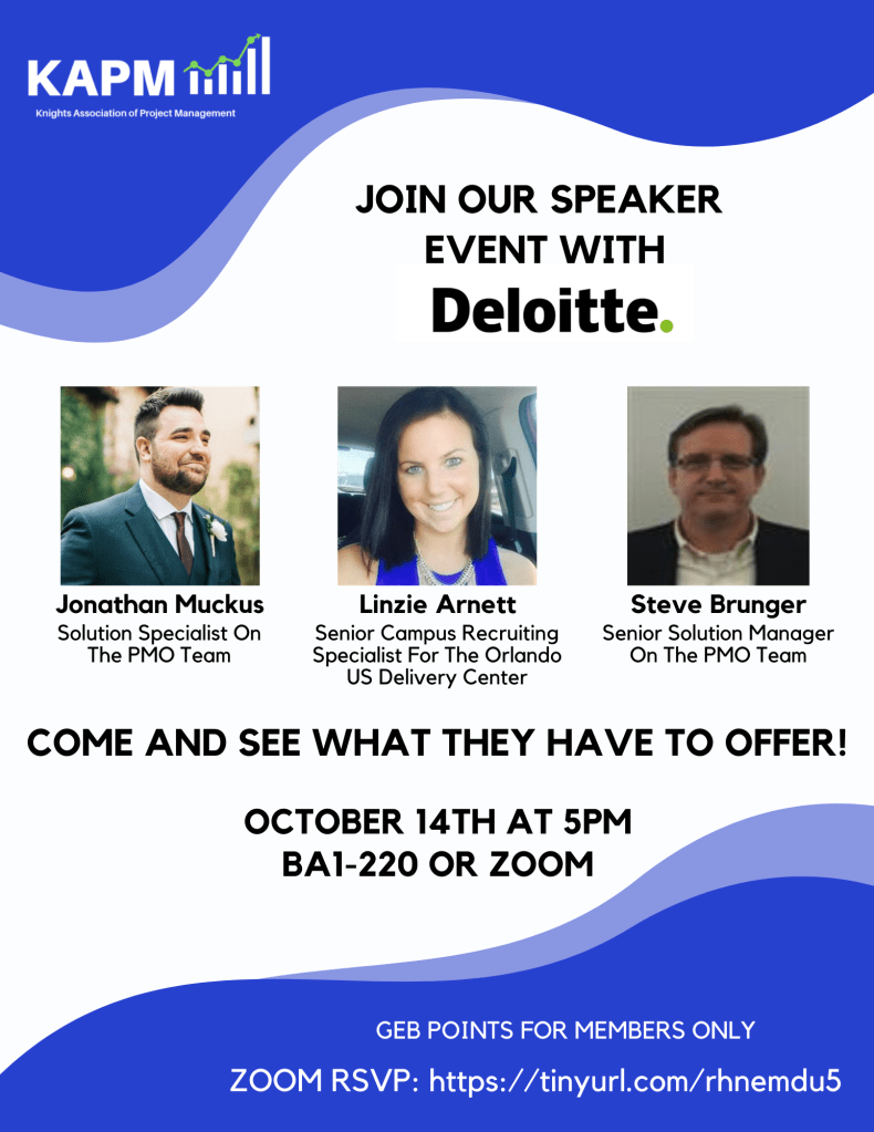 Join Knights Association of Project Management (KAPM) on Thursday, October 14th at 5 PM at BA1-220 or via Zoom as we host Jonathan Mockus, Solutions Specialist, and Steven Brunger, Sr. Solution Manager (both are from the PMO Team), and Linzie Arnett, Sr. Campus Recruiting Specialist with Deloitte!