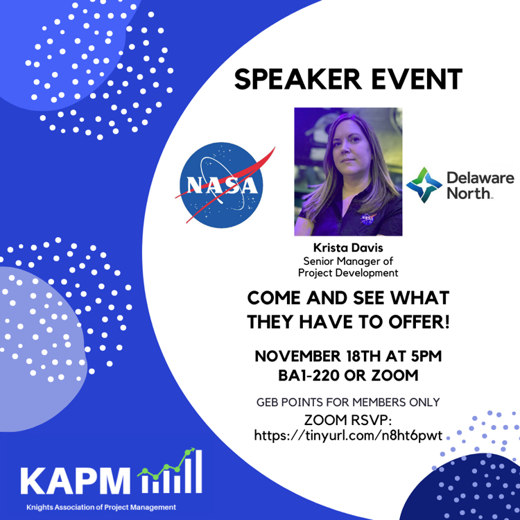 Join Knights Association of Project Management (KAPM) on Thursday, November 18th at 5 PM via Zoom or in BA1-220 as we host Krista Davis, Senior Manager of Project Development and UCF Integrated Business Alum with Delaware North/KSC Visitor Complex!