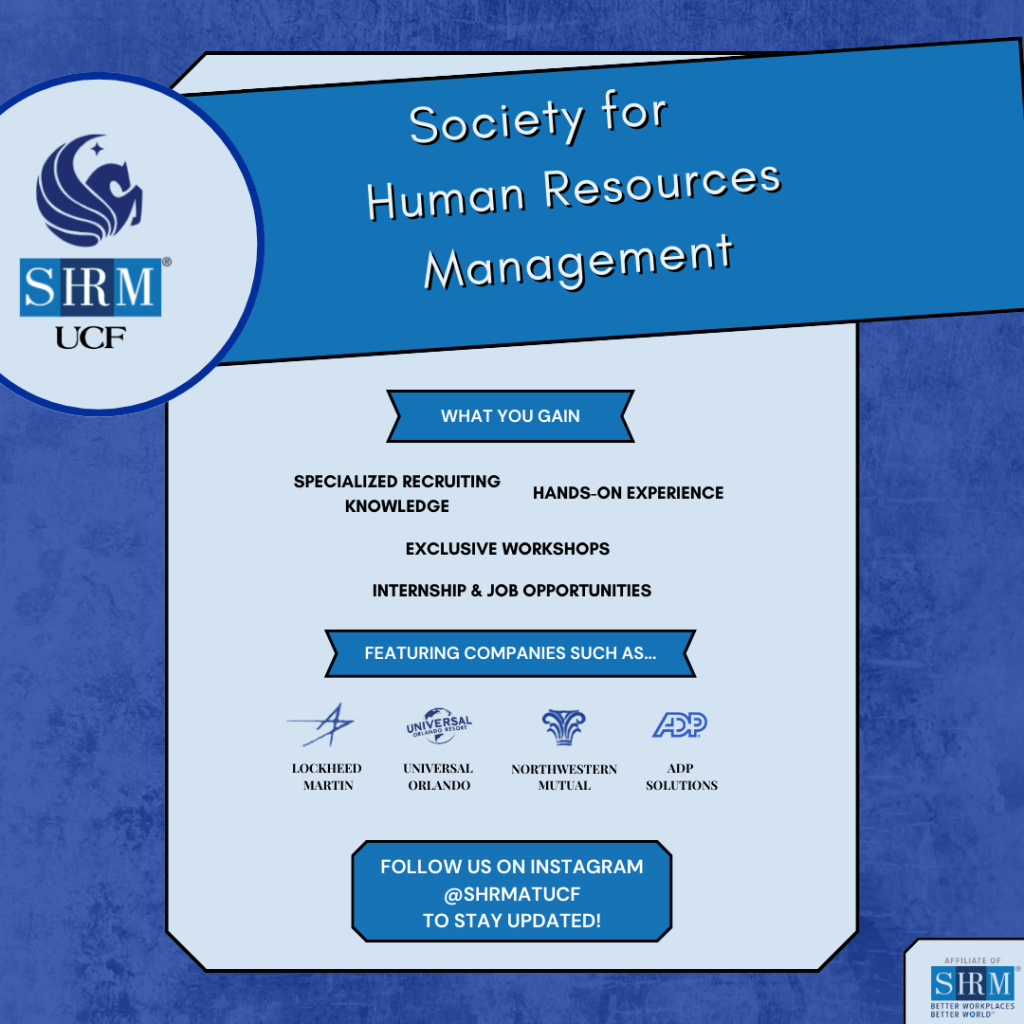 SHRM Student Chapter at UCF is an undergraduate and graduate service chapter promoting all majors’ education, networking, and leadership opportunities. We aim to provide you with the best connections on campus and in the community to help students find job placement, internships, volunteer opportunities, and overall experience to make yourself more marketable. Throughout the semester, we invite local business professionals from various backgrounds to share their knowledge of current and upcoming trends affecting the future professional. As an Integrated Business student, you can use the skills you have learned in the classroom to connect and communicate with all the HR professionals, getting you one step closer to your dream job.