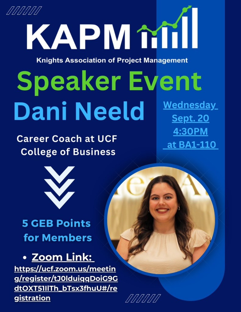 The Knights Association of Project Management (KAPM) will be hosting Dani Neeld with UCF Office of Professional Development on Wednesday, September 20th at 4:30pm in BA 1 – Rm 110 (in person), or you may attend via Zoom! Come earn 5 GEB points and prepare for this week’s College of Business Invitational Event!