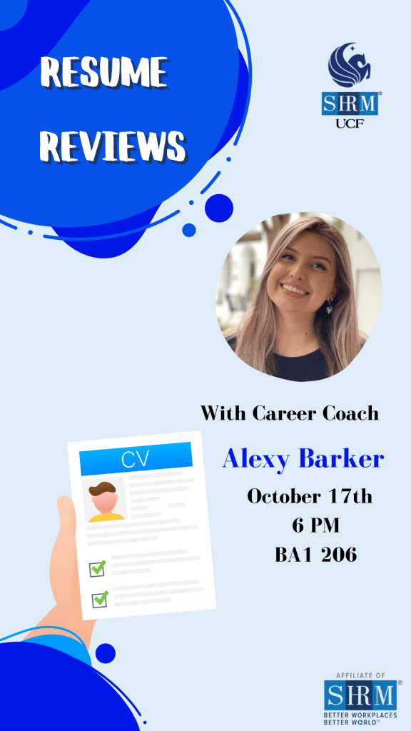 SHRM at UCF will be joined by Alexy Barker from OPD! Alexy will conduct a resume review workshop to assist our members with their resumes and help them put their best foot forward. Make sure to bring your resume and come join us on Tuesday, October 17th in room 206 from 6:00pm to 7:00pm!