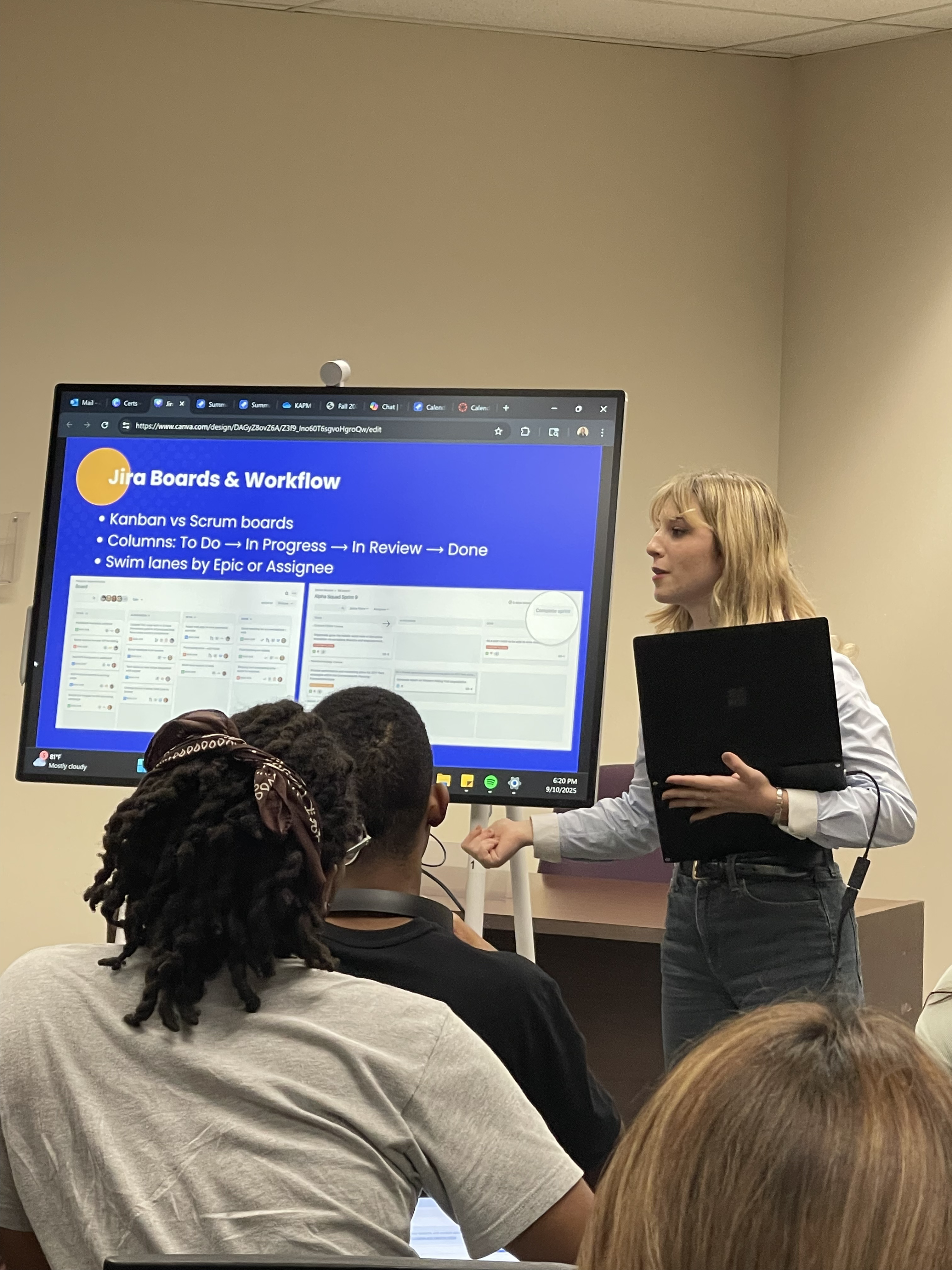 What makes Alexis’ leadership stand out is her professional experience. This past summer, she worked full-time at Lockheed Martin’s national headquarters in Bethesda, Maryland, serving in a project management role. She brought that expertise into the workshop, showing attendees how global organizations rely on Jira to manage complex, high-stakes projects.