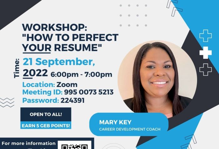 The Society of Human Resource Management (SHRM) will be hosting Mary Key as she explains “How to Perfect Your Resume” via Zoom.