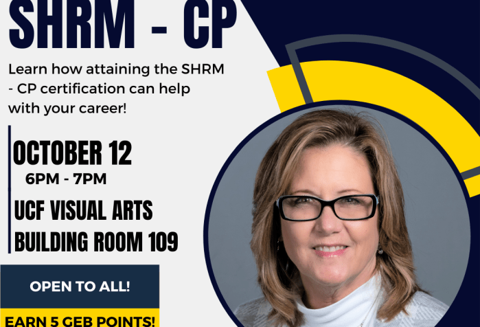 The Society of Human Resource Management (SHRM) will be hosting Linda Hamilton as she explains how an SHRM – CP certification can help your career (UCF Visual Arts Building Room … Continue Reading SHRM Workshop 10/12 at 6:00 pm! (5 GEB Points)