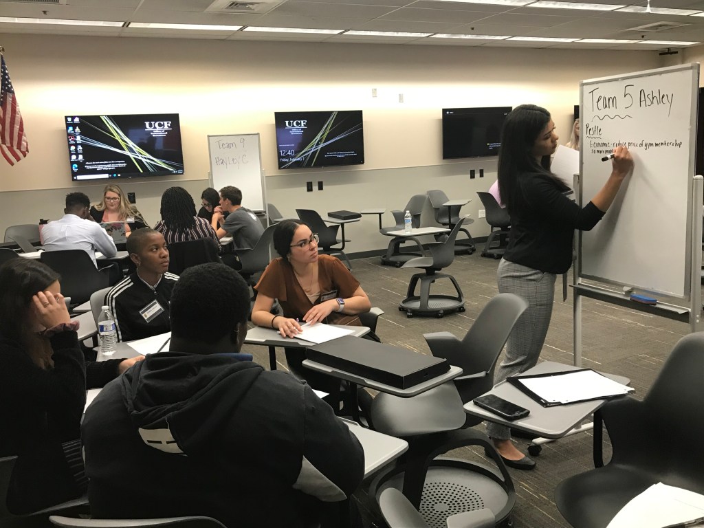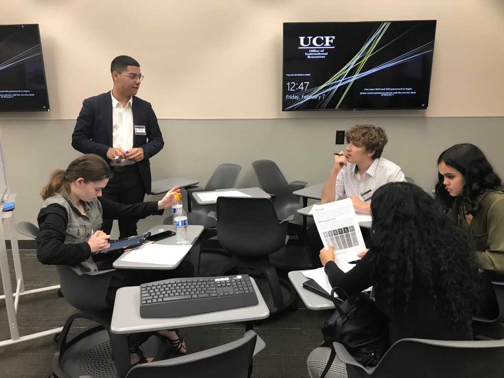 Professor Jennifer Morin: “The Integrated Business High School competition was an amazing event! It was valuable and meaningful for everyone involved as it provided an incredible opportunity for fostering the types of skills that our IB program prides itself upon – “soft” skills such as team building, leadership, critical thinking, collaboration, and presentation skills as well as technical, “hard” skills in disciplines such as marketing and strategic business analysis. High school students were able to come and receive training, coaching, and support from our current IB students, who shared skills they have refined throughout their UCF and IB coursework. It was incredible to see the teams of high school students analyze their cases and present their recommendations to IB Faculty and IB Alumni. High school teachers also had the opportunity to hear more about the “flipped” classroom through interactive professional development sessions with our IB faculty. ”